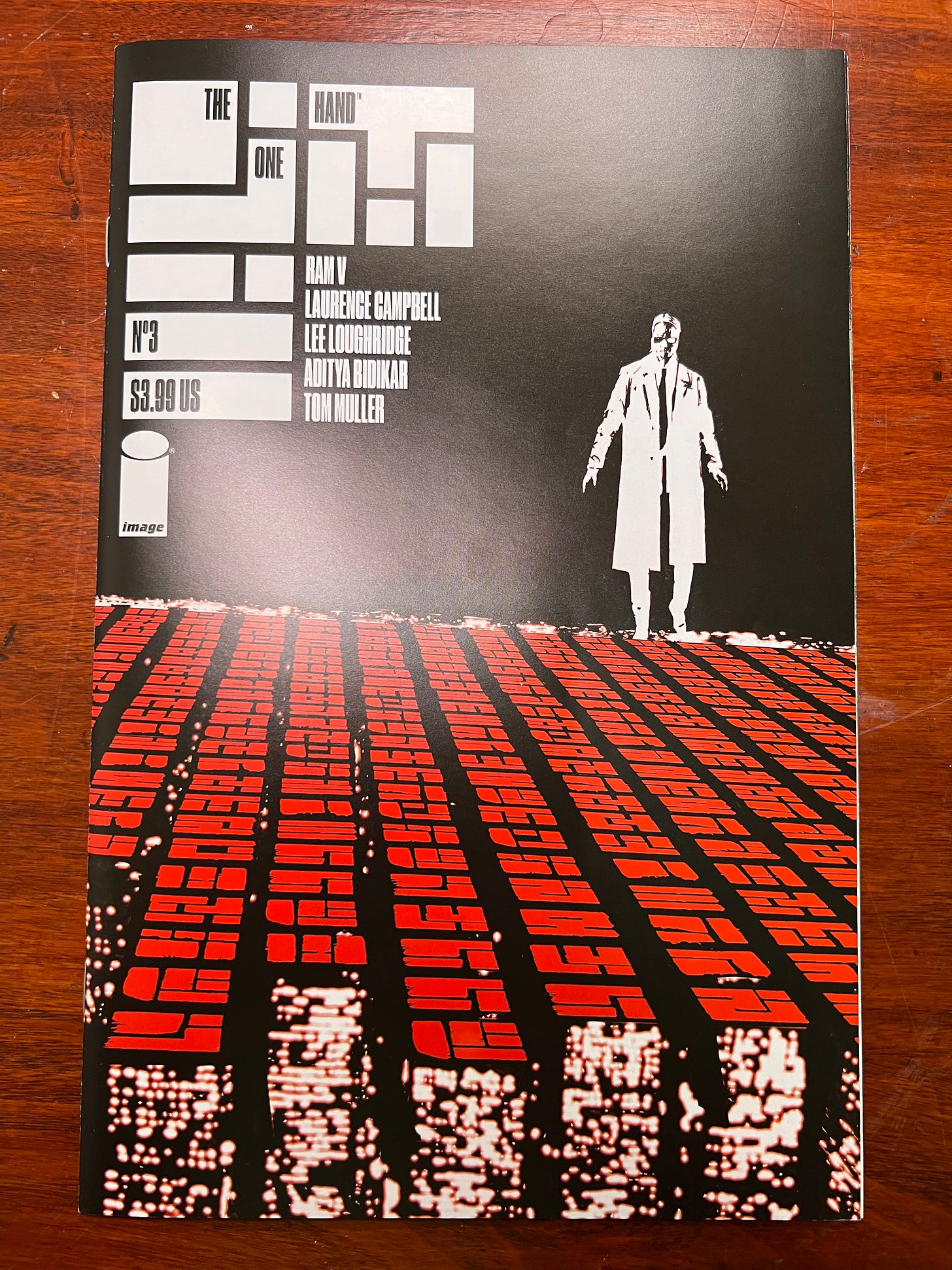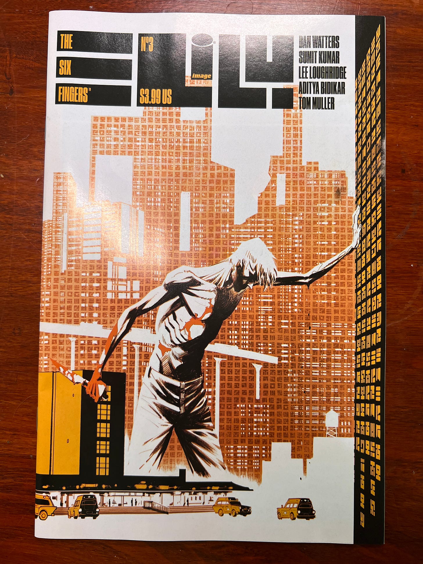 With the same letterer (Aditya Bidikar) and author (Ram V) as the above book, is the very graphic noir/sci-fi collaboration, The One Hand/The Six Fingers. These two books, one written by Ram V and one by Dan Watters, cover the same story from two points of view. One from the grizzled (I almost wrote gristled, which tells you how visceral the art is) detective on the edge of retirement, the other follows the killer (or so we believe).